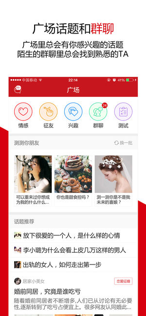 知己網(wǎng)開(kāi)發(fā)的兩性交友應(yīng)用。與陌陌、探探、百合、佳緣、珍愛(ài)等交友網(wǎng)站類似,知己APP更針對(duì)大齡、成熟人士,適合30歲以上的中年單身交友,同城約會(huì)相親,離異人士征婚。這里有眾多的優(yōu)質(zhì)大叔,熟齡美女,尋找有緣的婚戀對(duì)象或親密伴侶。知己網(wǎng)專注異性交友15年,有3800多萬(wàn)注冊(cè)用戶。知己APP引進(jìn)了國(guó)外facebook,instagram,line,snapchat,match,ins,tweet,twoo等熱門交友應(yīng)用的功能,結(jié)合中國(guó)用戶的實(shí)際需求。