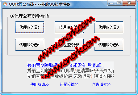 菲菲QQ代理公布器 V3.0 簡體中文綠色免費版 菲菲qq代理公布器是一款支持設(shè)置qq網(wǎng)吧代理,qq普通代理的一鍵代理,功能強大的ip代理軟件,增加兩組代理服務(wù)器,使用更加簡單化,所有代理服務(wù)器只需一鍵點擊即可免費使用,其他方面的一些改動優(yōu)化