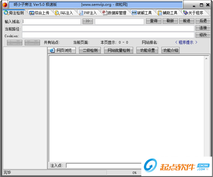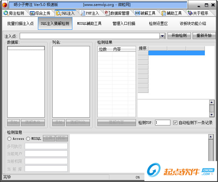3、SQL注入檢測(cè)功能:可批量對(duì)多個(gè)網(wǎng)站進(jìn)行注入點(diǎn)掃描、SQL注入猜解功能(多線程檢測(cè),可猜解中文)、自動(dòng)爆庫(kù)功能、后臺(tái)登陸地址掃描(多線程)、檢測(cè)設(shè)置專區(qū)!
