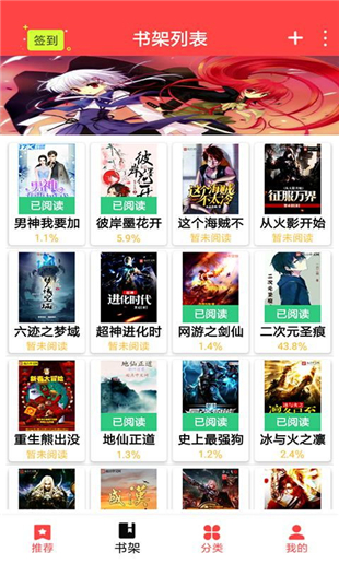 3、書架功能有:簽到、書架列表、添加書架、分享下載、書籍管理