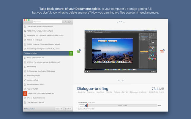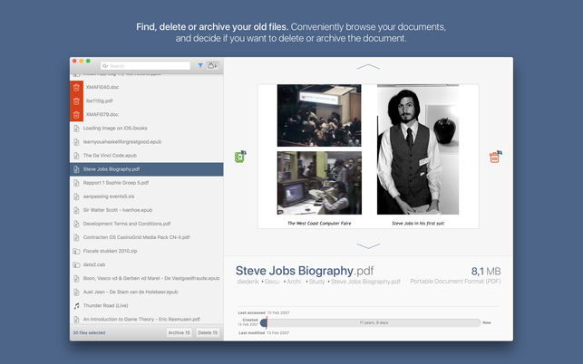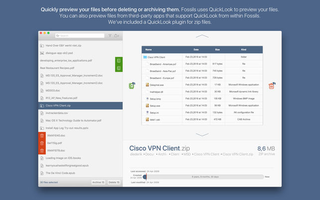 你的電腦的存儲已經(jīng)滿了,但你不知道該刪除什么?現(xiàn)在你可以使用Fossils Mac版來找到你不再需要的舊文件了。查找、刪除或歸檔舊文件。方便地瀏覽您的文檔,并決定是否要刪除或歸檔文檔。快速預(yù)覽你的文件,然后刪除或歸檔。