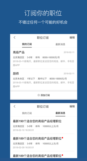 通過百度大數(shù)據(jù)精準(zhǔn)推薦,讓你更快速精準(zhǔn)的找到想要的工作,極大的提升求職效率。