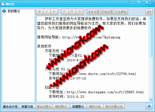 隨心記是一款美觀、使用的文檔編輯、管理工具。你可以用它管理自己的閱讀資料,你可以用它寫下自己的隨筆。你也可以用它來寫日記,至于日記的安全性,你可以放心,軟件采用密碼登陸,且密碼采用目前最安全的md5加密技術(shù)