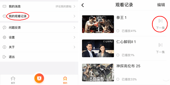 還有一個值得夸夸的貼心小設(shè)計。點擊右下角「我的」進(jìn)入個人中心,點擊「我的觀看記錄」,可以發(fā)現(xiàn),在觀看過的劇集后面有「下一集」的字樣。