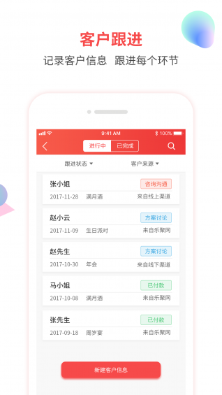 客戶跟進:記錄客戶信息,掌握跟進狀態(tài),客戶狀態(tài)一目了然,不再有漏單