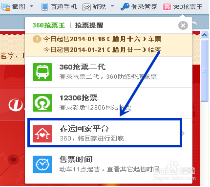 打開360瀏覽器,進入春運回家平臺,如下圖
