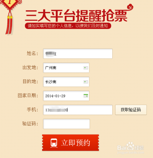找到填寫預(yù)約信息的地方,填上你的姓名,出發(fā)地,目的地,回家日期,手機號碼,點獲取驗證碼,如果收不到驗證碼,可以多試幾次。如下圖