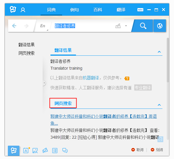 有道搜索引擎在抓取并獲得多達數(shù)十億的海量網(wǎng)頁數(shù)據(jù)后,利用有道獨創(chuàng)的“網(wǎng)頁萃取技術(shù)找出互為翻譯關(guān)系的中外文詞匯和句子,再通過優(yōu)化調(diào)整,得到最佳的翻譯結(jié)果。