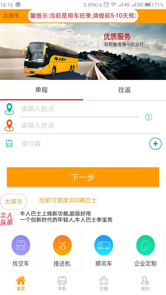目前牛人巴士已開(kāi)通河南省、山西省用車(chē)服務(wù),更多用車(chē)城市陸續(xù)開(kāi)通中.......