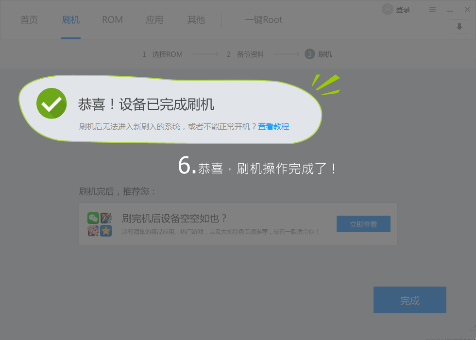 接下來就是見證奇跡的時(shí)刻,刷機(jī)成功啦!先可別急著得意,剛刷完機(jī)手機(jī)空空如也,現(xiàn)在就可以去應(yīng)用市場中安裝你喜歡的應(yīng)用了,當(dāng)然,可別忘了還原備份的數(shù)據(jù)哦。刷機(jī)精靈還有很多其他的實(shí)用小工具,可以讓你的手機(jī)更快更好用。