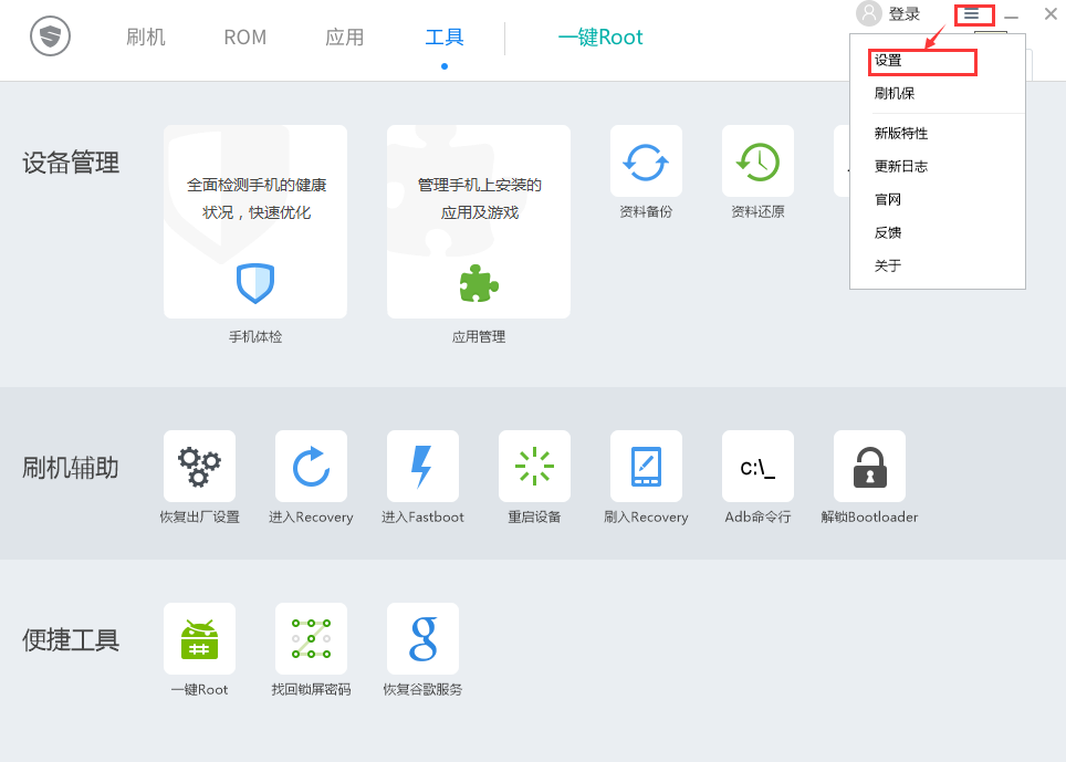 刷機(jī)精靈是否能更改備份路徑?當(dāng)然可以啦,打開刷機(jī)精靈軟件,點(diǎn)擊右上角的更多按鈕,選擇【設(shè)置】。