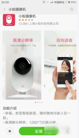 根據(jù)小蟻智能攝像機(jī)包裝盒內(nèi)的說(shuō)明書,通過(guò)二維碼掃描來(lái)下載“小蟻APP”或“小米智能家庭APP”安卓版手機(jī)程序。
