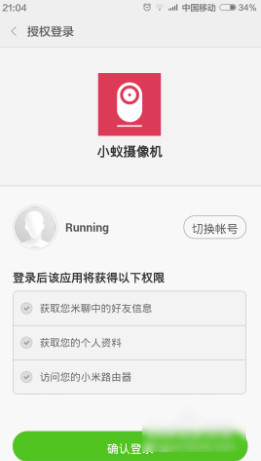 接下來(lái)為小蟻智能攝像機(jī)接觸電源,待指示燈呈黃色閃燈時(shí),打開手機(jī)APP,并連接到周圍同一WIFI網(wǎng)絡(luò)下。在此以“小蟻APP”為例,從打開的程序主界面中點(diǎn)擊“小米登陸”按鈕,利用小米賬號(hào)完成登陸操作。