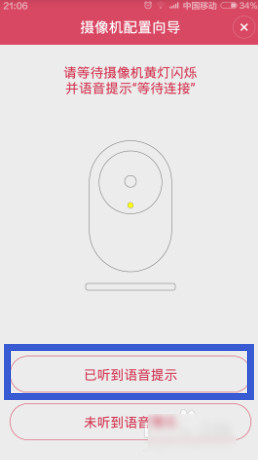 此時(shí)將進(jìn)入“攝像機(jī)配置向?qū)А苯缑妫绻牭叫∠仈z像機(jī)發(fā)出的“等待連接”語(yǔ)音提示時(shí),點(diǎn)擊“已聽到語(yǔ)音提示”按鈕。