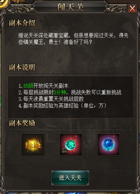玩家到達85級可以在盟重npc處進入“闖天關(guān)”副本。