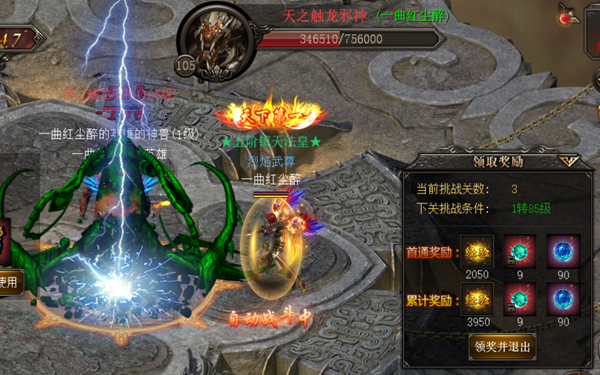 每層每天可以挑戰(zhàn)1次,挑戰(zhàn)失敗可以反復(fù)挑戰(zhàn)。每挑戰(zhàn)勝利一層,獎勵累加,玩家離開副本時發(fā)放獎勵。