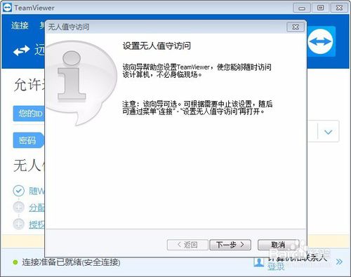 安裝完畢后會自動打開TeamViewer 12 遠(yuǎn)程軟件,此時會出現(xiàn)設(shè)置無人職守訪問,請不必理會它,點擊右下角“取消”即可。