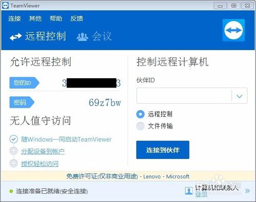 最后耐心等待一會,等左下角出現(xiàn)“連接準(zhǔn)備已就緒”時,ID 和 密碼已經(jīng)生成完畢,此時把 ID 和 密碼 告訴對方即可被對方遠(yuǎn)程控制電腦。