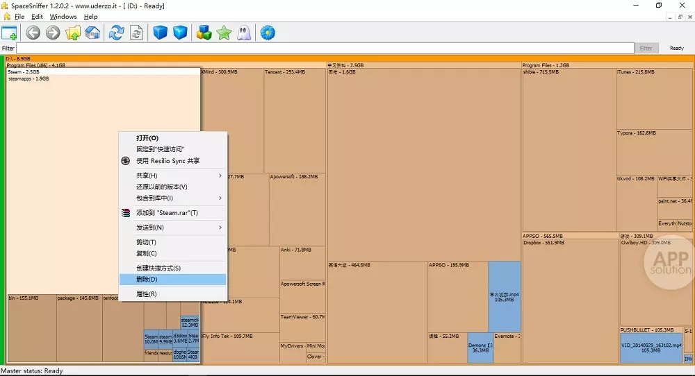 2.一些基本操作:運(yùn)行軟件后選擇需要掃描的硬盤(pán)分區(qū)/文件目錄,待分析完畢后,鼠標(biāo)懸浮在文件塊上可以顯示文件大小,雙擊可以展開(kāi)更多細(xì)節(jié),右擊則可以進(jìn)行文件操作,比如刪除和跳轉(zhuǎn)到該文件目錄。添加塊細(xì)節(jié)可以在一張Treemap中看到更多信息。