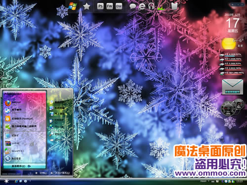 魔法桌面雪夜玻璃花電腦桌面主題用一張炫彩的冰花玻璃紋理做壁紙,光影變化之間玻璃花晶瑩剔透、流光溢彩,給你十足的視覺享受。還有配套的絢彩登陸界面哦