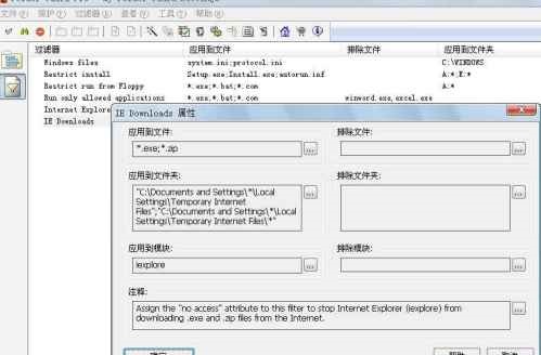 接下來,就是過濾列表,這個(gè)說實(shí)話我也不是很明白,點(diǎn)開其中一個(gè)說下什么意思吧?!皯?yīng)用到文件”即生效的文件,“應(yīng)用到文件夾”即生效的文件夾,“應(yīng)用到模塊”,即生效的程序。應(yīng)該是排除誤報(bào)的作用。