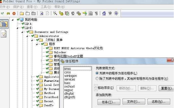 還有“信任程序”,個(gè)人沒有對這個(gè)功能進(jìn)行配置,使用也很簡單,點(diǎn)擊“任務(wù)”出現(xiàn)當(dāng)前程序列表,添加就可以了,也可以點(diǎn)擊“瀏覽”找到程序文件。應(yīng)該是訪問權(quán)限的白名單吧。