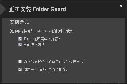 接下來我們要選擇安裝FolderGuard時(shí)候的創(chuàng)建的快捷方式。我們可以選擇創(chuàng)建開始菜單快捷方式、桌面快捷方式和創(chuàng)建一個(gè)還原點(diǎn)。選擇好之后點(diǎn)擊下一步繼續(xù)安裝進(jìn)程;
