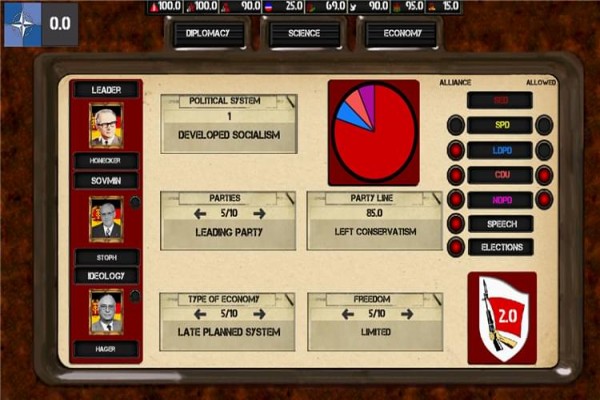 東德情結(jié)柏林墻(Ostalgie: The Berlin Wall)是一款超級(jí)好玩的策略類游戲。該游戲主要是以柏林墻東西德時(shí)代為背景,開(kāi)創(chuàng)新時(shí)代,玩家將成為政治級(jí)人物,通過(guò)一系列政策來(lái)實(shí)施改革,注意預(yù)算資金的分配,否則世界將會(huì)停滯不前。