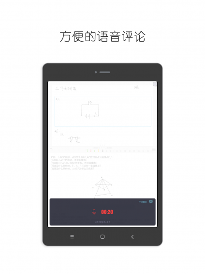 獲取任務(wù)后教師就可以批閱任務(wù)了,客觀題部分有后臺判,主觀題有教師判。教師根據(jù)用戶的答案為用戶判題,可以選擇對、半對、錯誤,每判完一道題教師可以對該題進行評論,語音評論和文字評論均可,對后臺判的客觀題也可以加評論。整份試卷判完,教師可以對該次周練或作業(yè)進行整體語音和文字評論。
