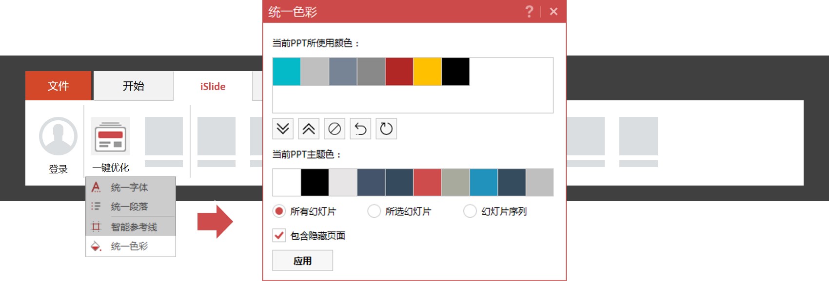 iSlide「統(tǒng)一色彩」功能,在iSlide插件“設(shè)計”組中。點擊「一鍵優(yōu)化」下拉菜單,點擊「統(tǒng)一色彩」會彈出功能窗口