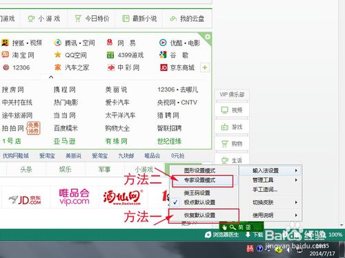 到這里有兩種方法解決問題!第一種,點(diǎn)擊“恢復(fù)默認(rèn)設(shè)置”,把它恢復(fù)到默認(rèn),一般能解決問題!這個方法的缺點(diǎn)就是會把你原來的個性設(shè)置都還原掉!我推薦使用第二種方法:選擇“專家設(shè)置模式”,修改輸入法的設(shè)置