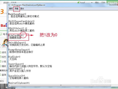 在文件里找到“HideCandWnd=0”字行,把里面的0改為1,再點(diǎn)擊“存盤”,最后“退出”,即可完成設(shè)置