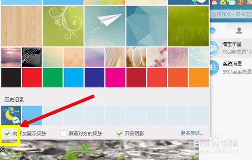 這個時(shí)候你的聊天界面立馬就會更換成這個皮膚了,左下角也會出現(xiàn)歷史記錄,有紅勾表示你正在使用這個皮膚