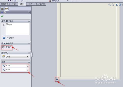 固定圖形界限。選中矩形左下角的點(diǎn),在右側(cè)出現(xiàn)的點(diǎn)的屬性對(duì)話框中做如下設(shè)置:參數(shù)區(qū)域,設(shè)定點(diǎn)的坐標(biāo)為(0,0),添加幾何關(guān)系區(qū)域中單擊“固定”圖標(biāo),將點(diǎn)固定在(0,0)上。