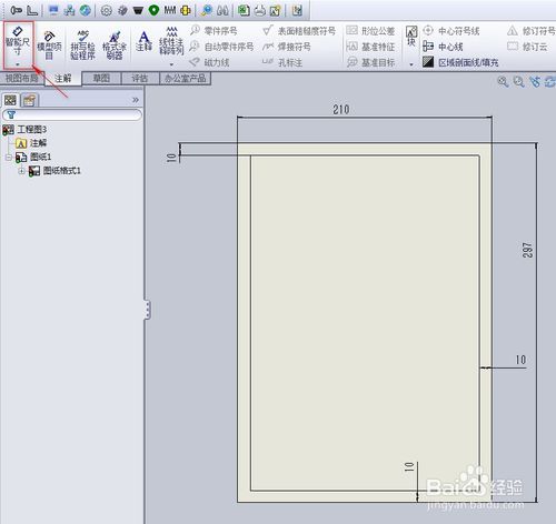 編輯圖框線。單擊“智能尺寸”按鈕,添加下圖所示的尺寸約束。