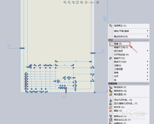 隱藏尺寸標(biāo)注。框選所有尺寸,單擊鼠標(biāo)右鍵,在彈出的對(duì)話框中選擇“隱藏”命令,隱藏后的效果如圖。