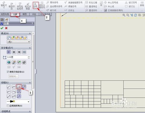 添加文字注解。單擊“注解”模塊,選擇“注釋”選項(xiàng),在注釋屬性的“引線”屬性中,選擇無(wú)引線按鈕。然后添加如圖所示的注解文字。