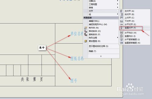 調(diào)整注解文字。選中標(biāo)題欄中的“單位名稱”、“圖紙名稱”、“圖號(hào)”,單擊鼠標(biāo)右鍵,在彈出的對(duì)話框中選擇,”對(duì)齊”--”豎直對(duì)齊”。以同樣的方式完成其他注解的對(duì)齊。完成后如圖