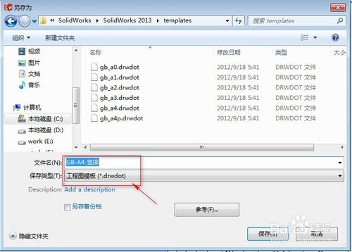 選擇下拉菜單,單擊【文件】-【另存為】,在系統(tǒng)彈出的另存為對(duì)話框中,輸入文件名“GB-A4-豎排”,保存類(lèi)型選擇“工程圖模板(.drwdot)”,單擊保存,完成。