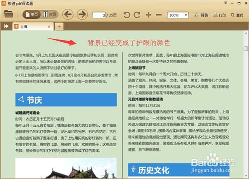 點(diǎn)擊“護(hù)眼”應(yīng)用菜單以后,我們發(fā)現(xiàn),原來(lái)的PDF文檔的背景是白色的,現(xiàn)在已經(jīng)變成了一種淺綠色的背景,看起來(lái)對(duì)眼睛有好處,說(shuō)明我們的設(shè)置已經(jīng)成功,如圖所示。