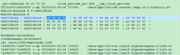 游戲變速通過GOT Hook 實(shí)現(xiàn)。首先注入lib9.so到游戲進(jìn)程,然后修改游戲進(jìn)程GOT中clock_gettime項(xiàng)為lib9.so中的0x42A4函數(shù),圖2為游戲進(jìn)程被修改后的GOT,可以看到clock_gettime位于lib9.so進(jìn)程空間。