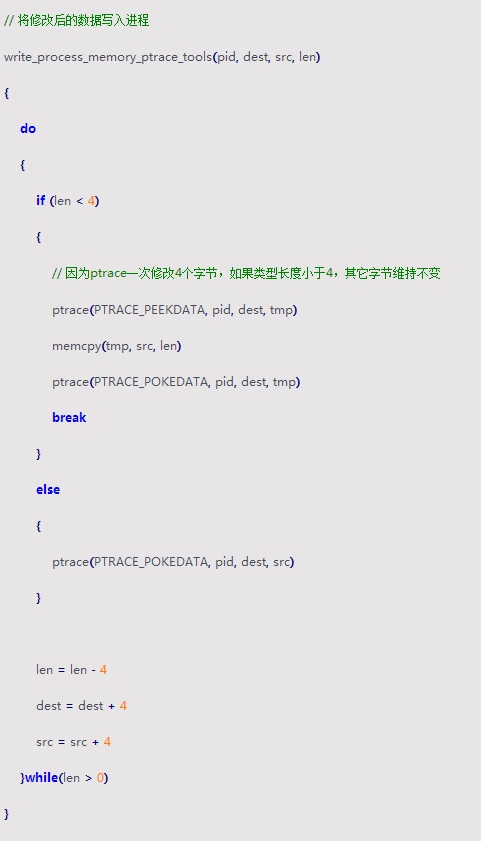 1 內(nèi)存修改實(shí)現(xiàn)原理內(nèi)存修改分兩步,第一步搜索內(nèi)存:以頁為單位讀取/proc/$pid/mem,查找指定數(shù)據(jù)并記錄命中地址。因?yàn)椴檎疫^程中內(nèi)存是動態(tài)的,所以顯示時(shí)會調(diào)用ptrace(PTRACE_PEEKDATA),再讀一次內(nèi)存中的內(nèi)容進(jìn)行顯示,這樣可能出現(xiàn)命中列表中有些值不等于期望數(shù)據(jù)的情況;第二步修改內(nèi)存:內(nèi)存修改通過ptrace(PTRACE_POKEDATA)實(shí)現(xiàn)。下面給出內(nèi)存修改的偽代碼(函數(shù)經(jīng)過重命名處理,詳情見附帶的idb文件):