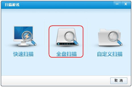 二、點(diǎn)擊后,彈出掃描游戲窗口,窗口中有三種掃描類型:快速掃描、全盤掃描、自定義掃描,如圖2