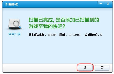 四、掃描完成后,彈出掃描完成窗口提示是否添加已掃描游戲到我的快吧,如圖5