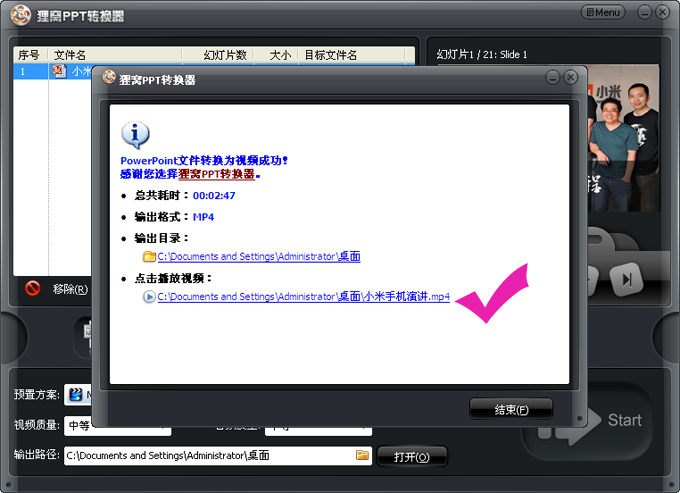 步驟6:等到ppt轉(zhuǎn)換成視頻之后,可以看到最終的軟件界面提示。直接點(diǎn)擊“輸出目錄”獲得轉(zhuǎn)換后的MP4視頻文件;也可以打開(kāi)下面“點(diǎn)擊播放視頻”鏈接可以預(yù)覽轉(zhuǎn)換后的MP4視頻文件。