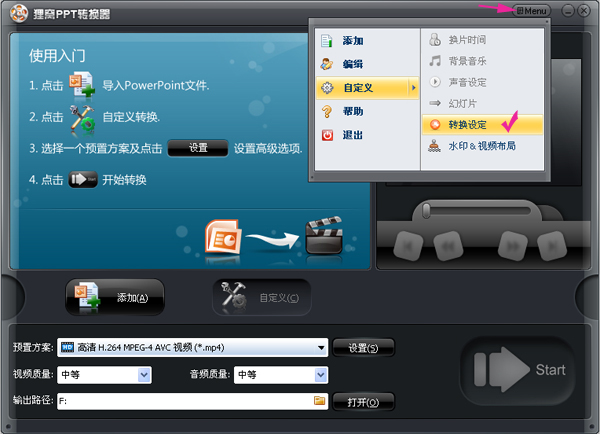 office ppt文件導(dǎo)入錯(cuò)誤或轉(zhuǎn)換失敗或一直在轉(zhuǎn)換狀態(tài)嘗試解決方案登陸貍窩ppt轉(zhuǎn)換器,Menu菜單選擇自定義-轉(zhuǎn)換設(shè)定,如下圖所示: