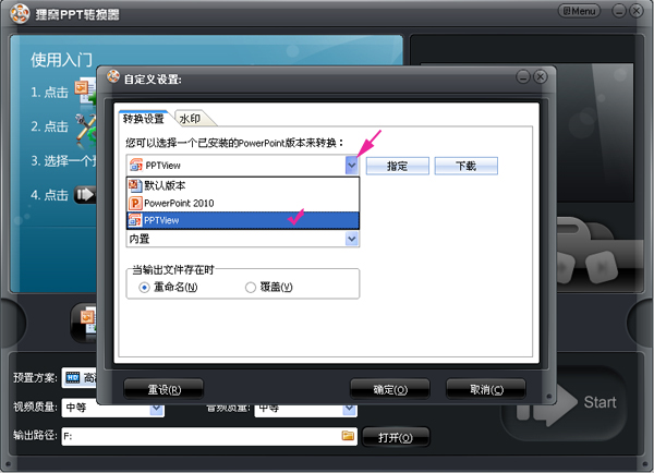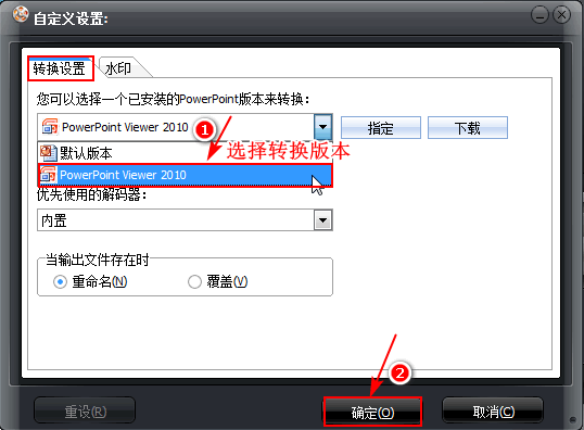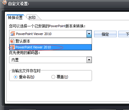 進(jìn)入自定義設(shè)置界面,選擇已安裝的PowerPoint版本為“PowerPointViewer2010”,然后點(diǎn)擊“確定”。如果沒(méi)有安裝PowerPointViewer,則這里就無(wú)法選擇PowerPoint版本,所以大家不要忘記PowerPointViewer的安裝操作。