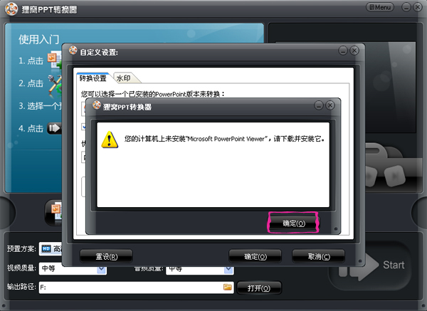 點(diǎn)擊“確定”按鈕下載并安裝MicrosoftPowerPointViewer,下載后安裝成功后!重啟貍窩ppt轉(zhuǎn)換器,再進(jìn)入這一步選擇PPTView,如下圖所示: