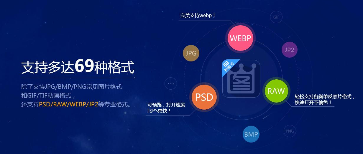 4、支持69種格式:更多格式支持,比傳統(tǒng)圖片查看器支持更多的圖片格式,除了BMP/PNG/JPG等常見圖像格式,更兼容PSD/RAW等專業(yè)圖像格式,多達69種。