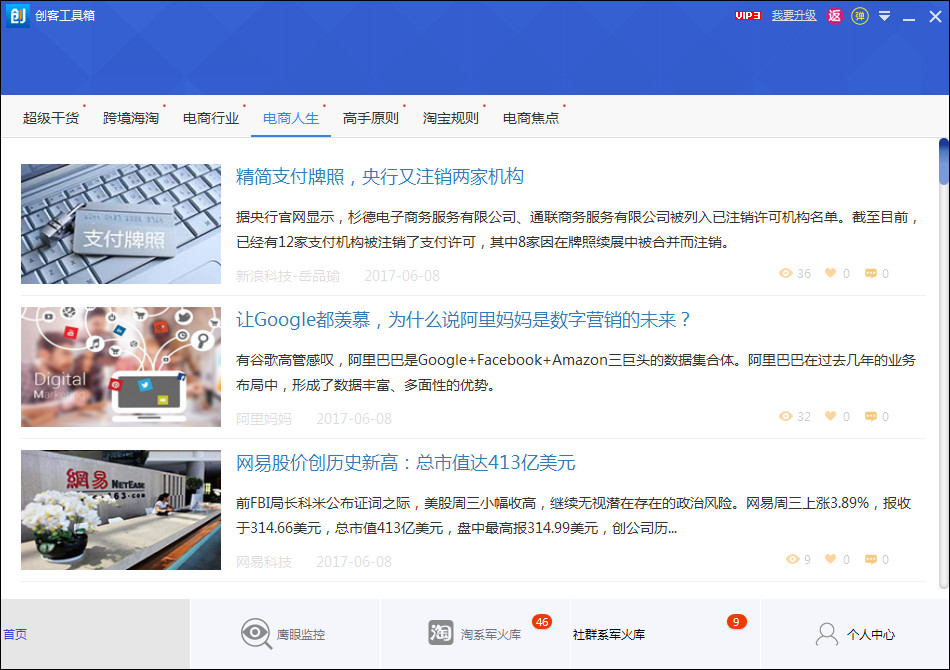 創(chuàng)客工具箱免費版是一款優(yōu)秀的淘寶天貓店鋪流量查詢監(jiān)控工具。創(chuàng)客工具箱破解版可支持淘寶流量查詢、天貓流量查詢、大數(shù)據(jù)分析、關(guān)鍵詞查詢、圖片處理以及其他功能,幫助淘寶賣家及時掌握自己的店鋪數(shù)據(jù),有效的提高淘寶店鋪的流量和排名。